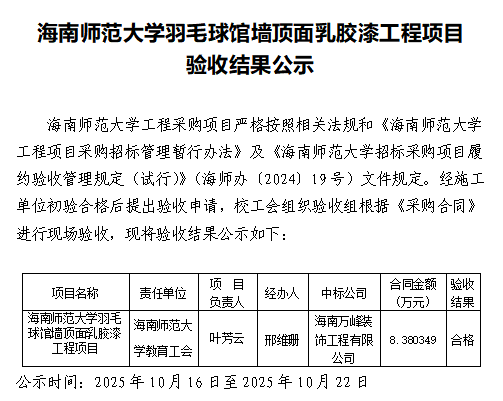 海南师范大学羽毛球馆墙顶面乳胶漆工程项目验收结果公示