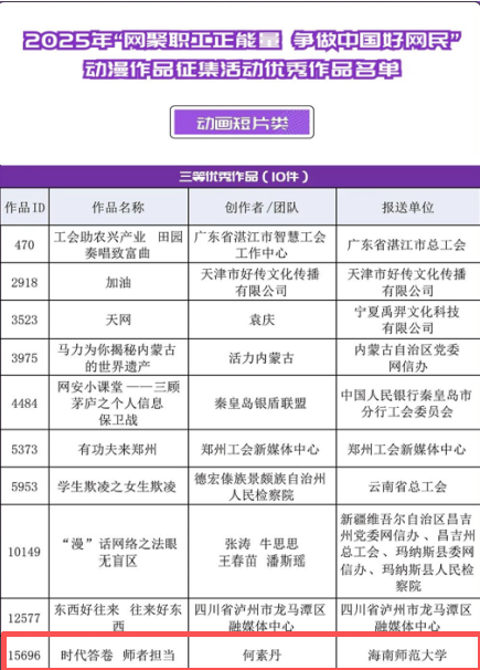 近日,由中华全国总工会与中央网信办联合主办的2025年“网聚职工正能量 争做中国好网民”主题活动评选结果揭晓。我校教师何素丹创作的作品《时代答卷 师者担当》在激烈竞争中脱颖而出,荣获动画短片类三等奖。