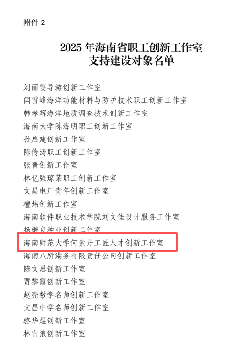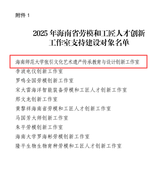 近日,我校张引教授主持的创新工作室和何素丹教授主持的创新工作室成功入选2025年海南省总工会建设对象,并获专项补助。张引文化艺术遗产传承教育与设计创新工作室入选“2025年海南省劳模和工匠人才创新工作室”,并获得补助资金人民币拾万元(¥100,000);何素丹工匠人才创新工作室入选“2025年海南省职工创新工作室”,并获得补助资金人民币伍万元(¥50,000)。